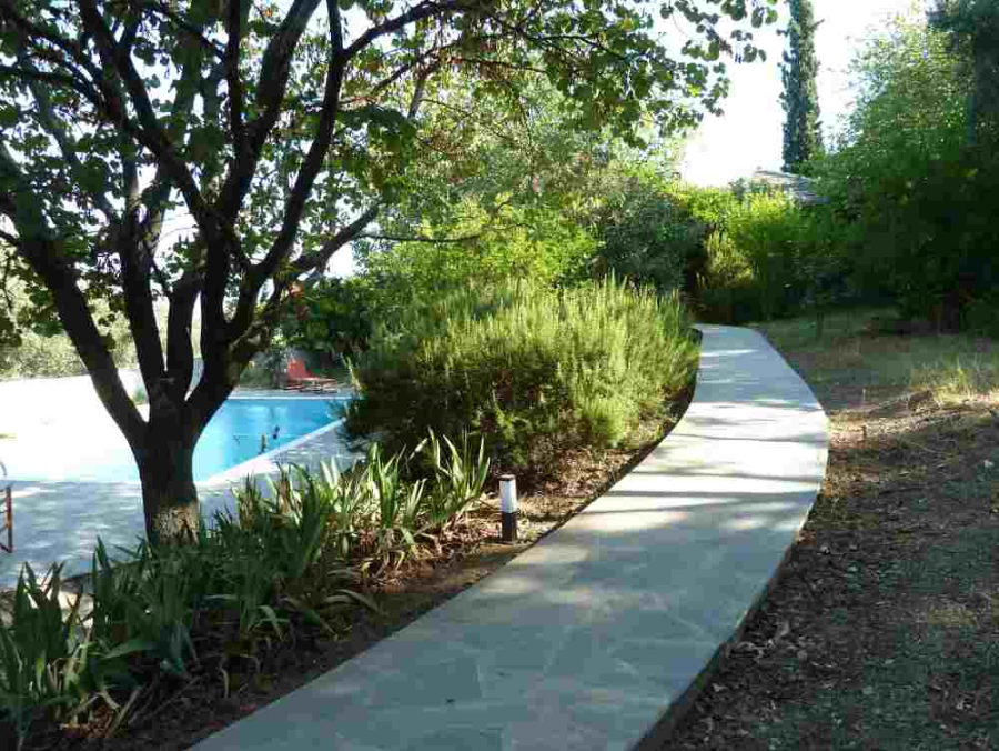 Im Garten befindet sich ein moderner Pool mit den Maßen 8 x 4 Meter (Tiefe ca. 1,80 bis 2.20 Meter), der von schönen Terrassen umgeben ist. Auch dort gibt es den ganzen Tag über Baumschatten.